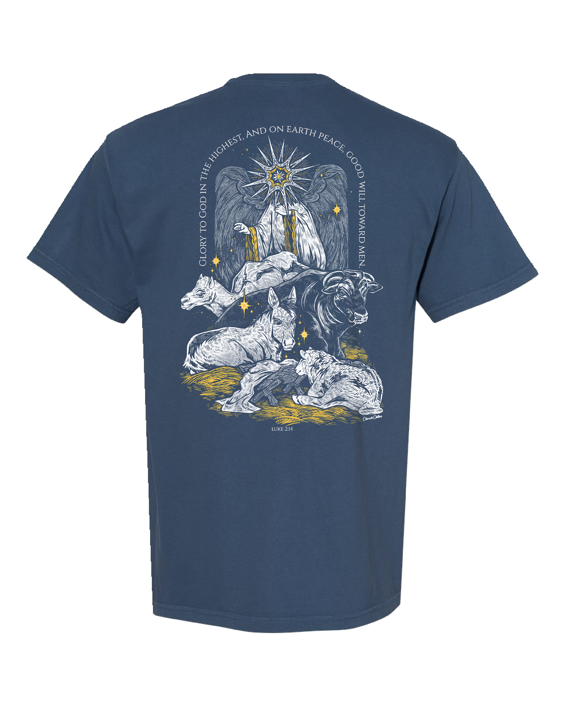 This tee was designed around the message of the angels to the shepherds. These men were watching their sheep in the fields one night and then angels from on high appeared. They were afraid, but the angels told them of what God had done that night! They went and found the baby Jesus just as the angels foretold.