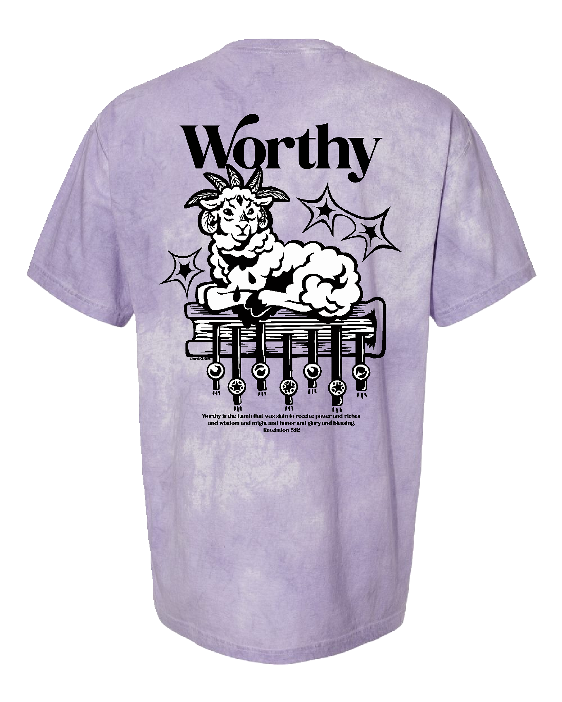 This tee was designed around the vision John beheld while in exile on Patmos. He saw the throne room of God, with the four living creatures and the myriads of angels attending. One called out, “Who is worthy to open the book and to break its seals?” John wept, but Jesus was found worthy!